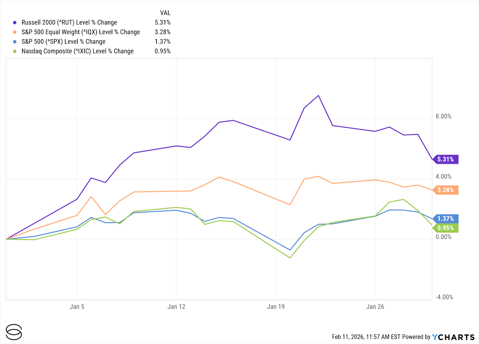 January equity performance reflected a meaningful shift beneath headline index returns, with broader participation across market capitalizations and styles. Small-cap equities led the market for the month, with the Russell 2000 posting the strongest gains, while the S&P 500 Equal Weight Index also outperformed its cap-weighted counterpart.