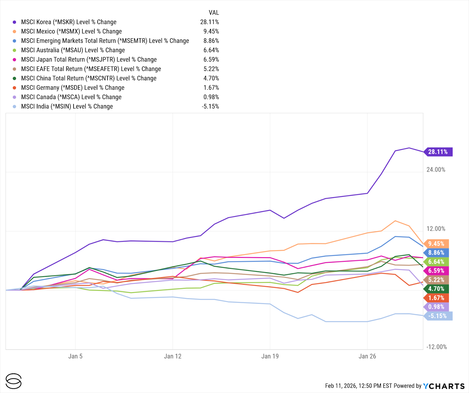 International equity performance in January was defined by significant country-level dispersion, as local fundamentals and sector composition outweighed broad regional trends. South Korea was a primary leader, with performance catalyzed by a record-breaking export print. Outbound shipments surged 33.9% year-over-year, fueled by a 103% jump in semiconductor exports as global demand for AI-related hardware intensified. Japan also maintained its 2025 momentum; despite a January rate hike by the Bank of Japan, resilient corporate earnings and ongoing governance reforms supported exporters and kept the Nikkei 225 on a solid footing.