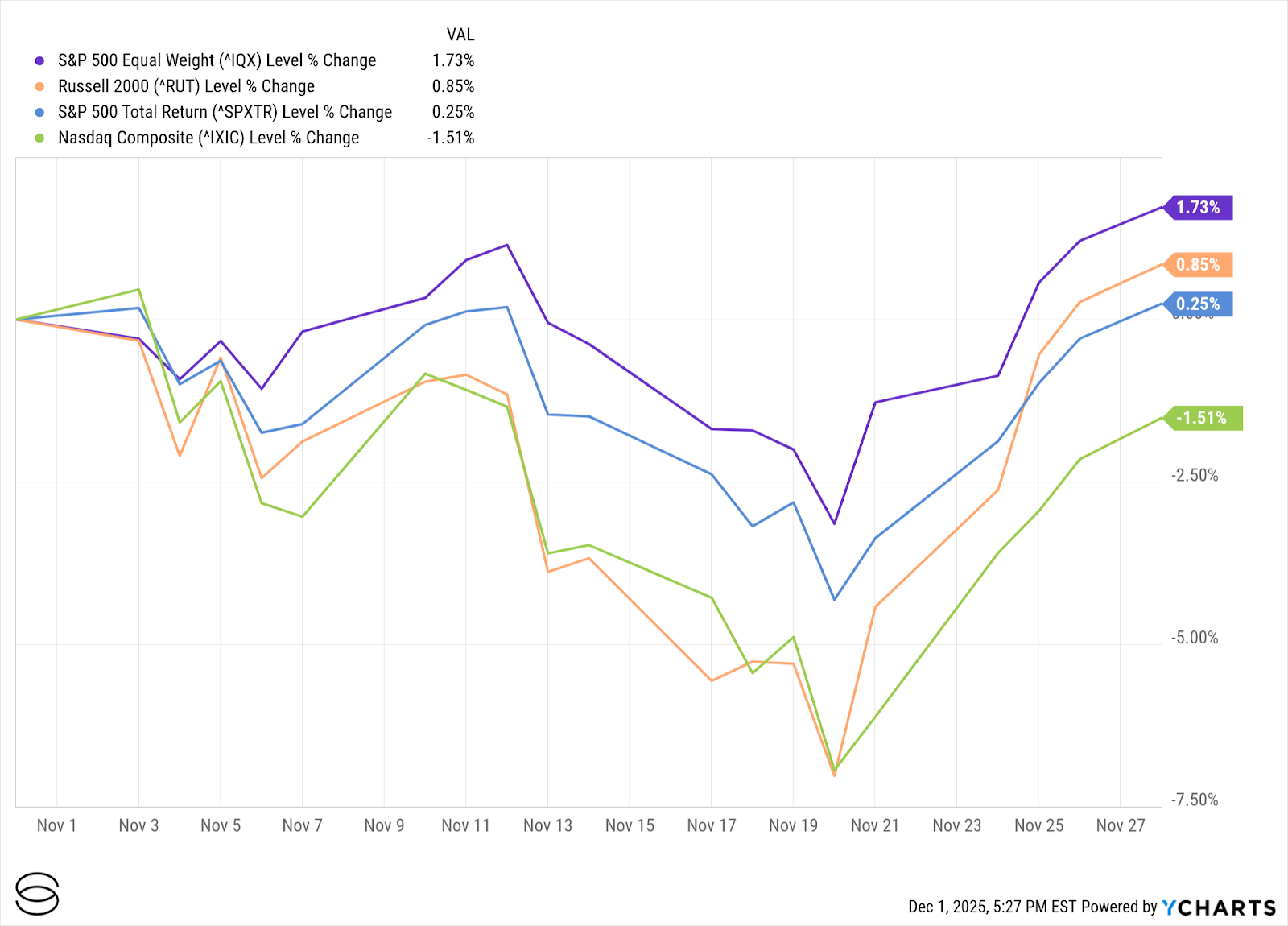 November's equity performance reinforced a theme we have highlighted for some time: the power and fragility of concentrated market leadership.