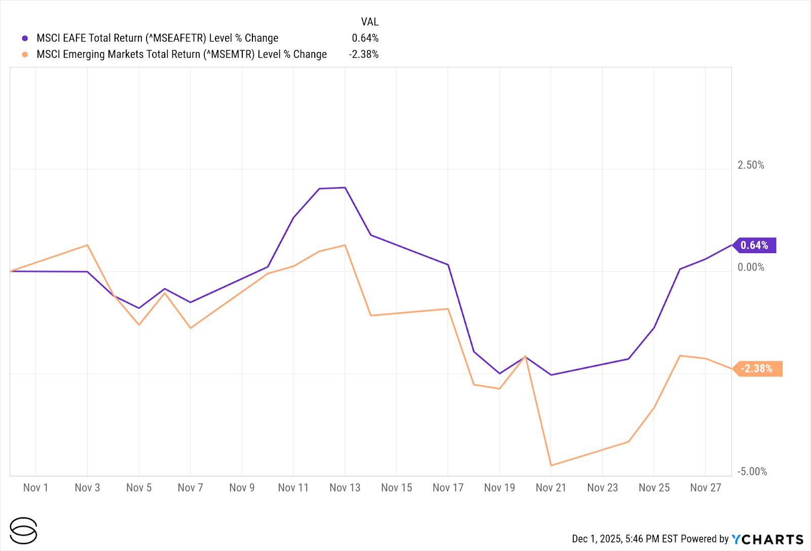 Developed international markets posted mixed but generally positive results, helped by a softer dollar and incremental progress on inflation across Europe and other major economies. Earnings revisions have stabilized in several regions, giving international allocations a firmer footing even as policy and political risks remain in focus.