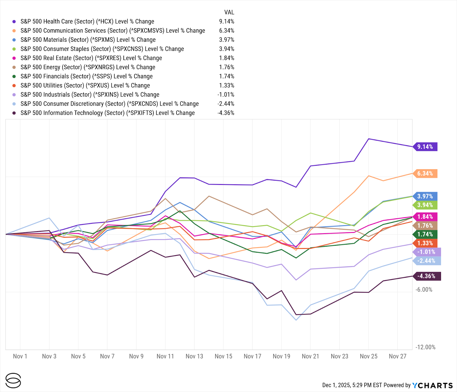Beneath the headline numbers, rotation was meaningful. Health care delivered one of its strongest months in years. Rate-sensitive sectors like utilities and consumer staples also outperformed, while high-momentum growth groups lagged as investors paused to reassess how much future AI demand is already priced in.