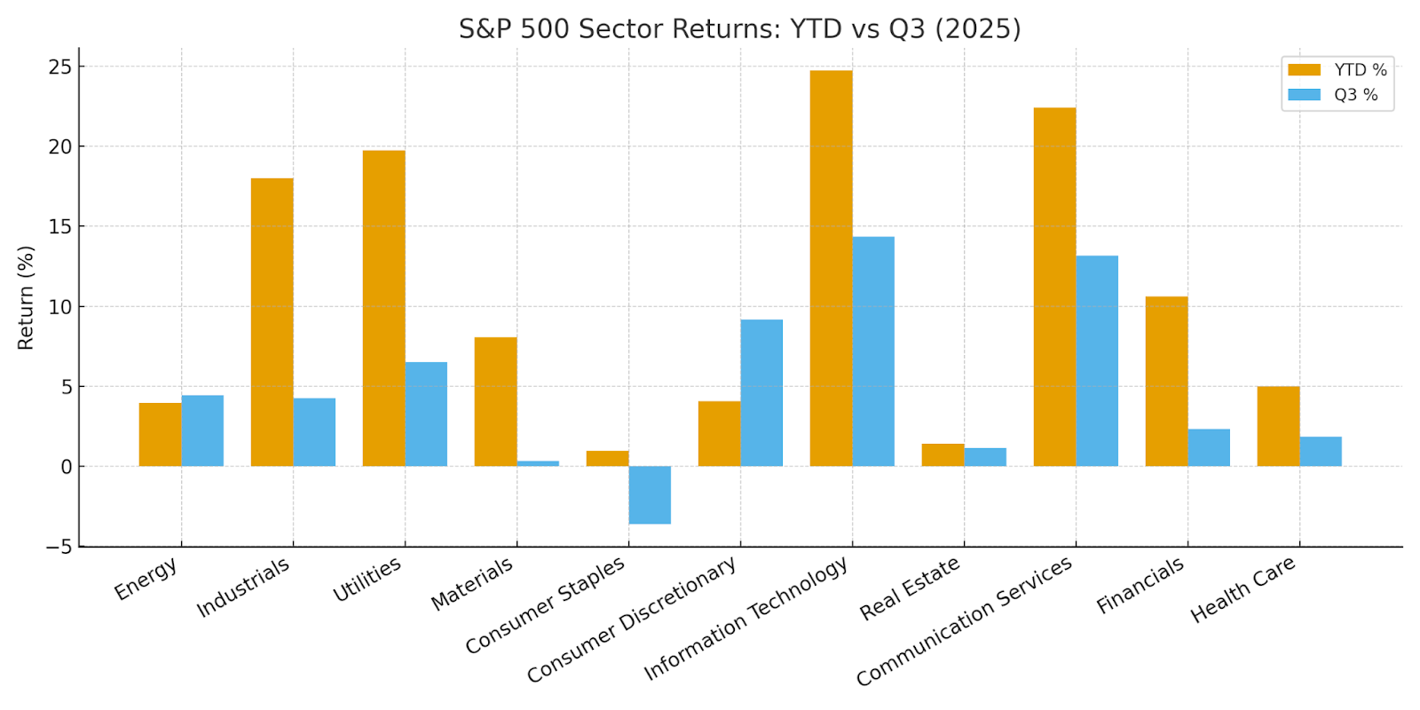 Exhibit 3: Bar chart of sector returns (YTD through Sept and Q3 2025)