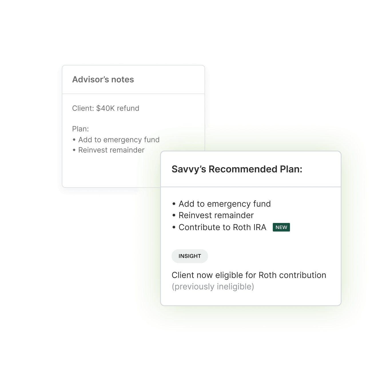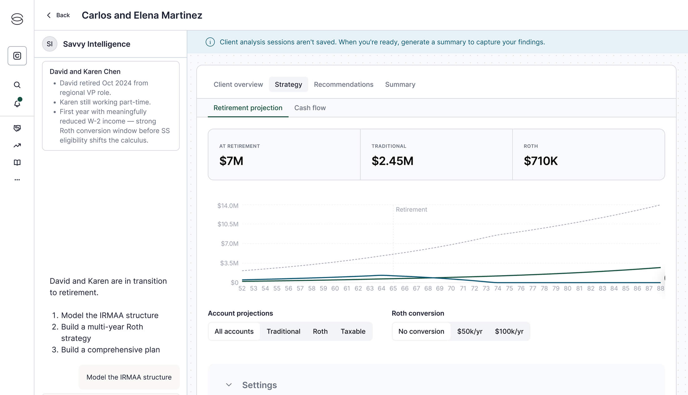 Savvy Intelligence sees your clients’ full picture and finds opportunities you might not have caught: a Roth window that reopened, a tax-loss opportunity, an IRMAA surcharge that shifts the math.