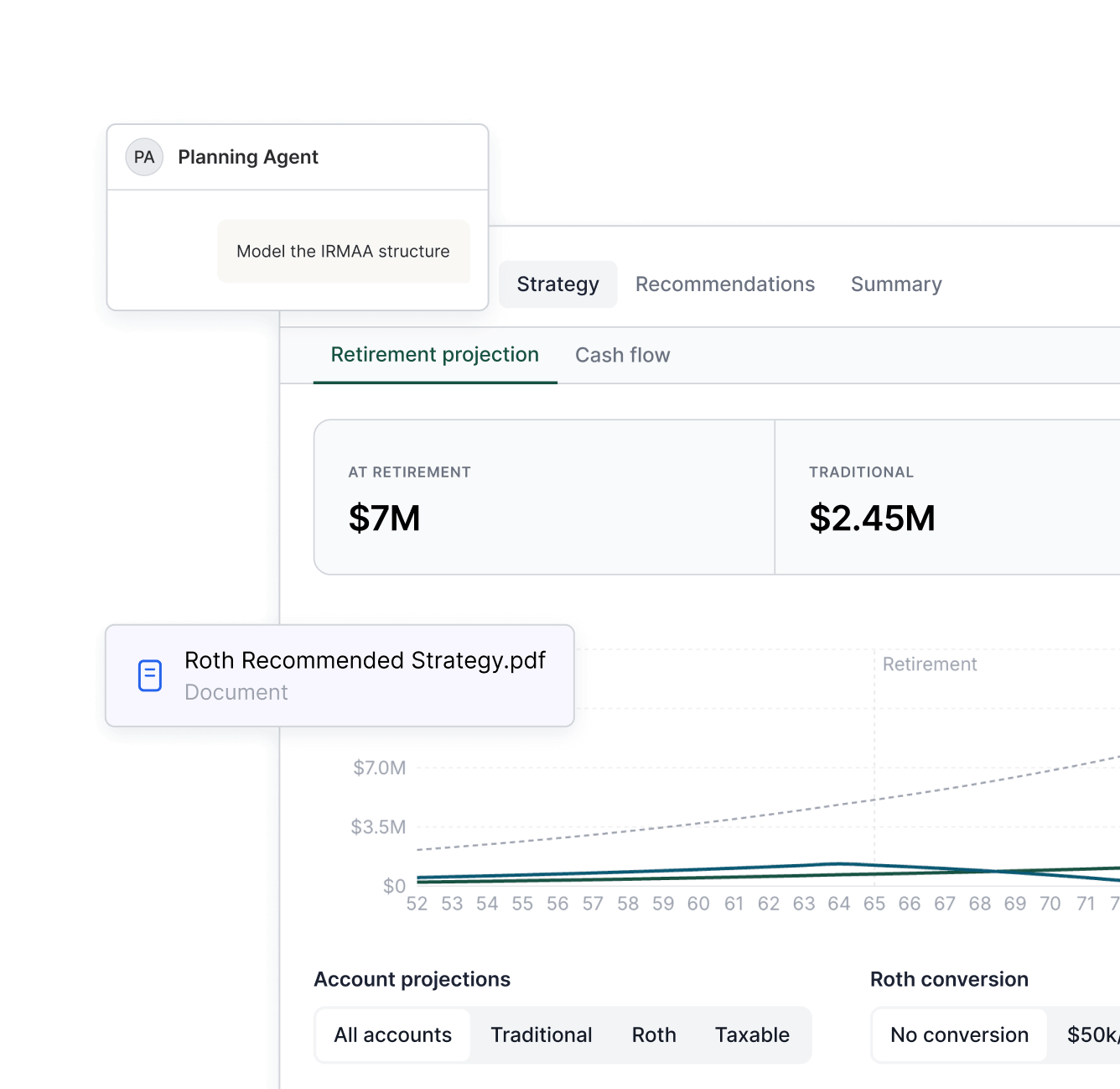 Planning scenarios that used to take 3 hours happen in one interactive session. The agent draws on your client’s full financial picture, can run thousands of “what if” scenarios, and produces a client-ready summary publishable in one click.