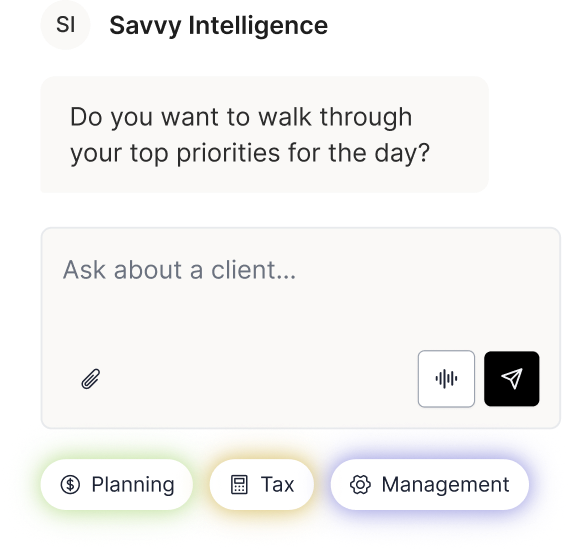 Savvy Intelligence brings your clients' complete financial picture into one AI-powered workspace. Hours of prep become minutes. A single advisor becomes a complete practice.